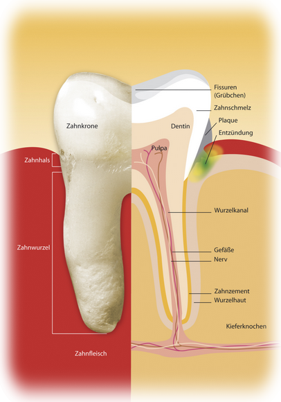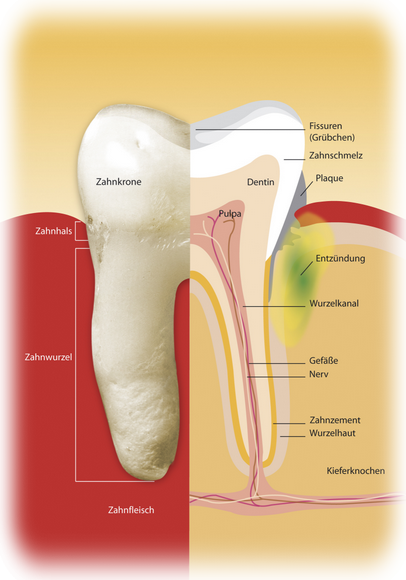 Unter Parodontitis versteht man die entzündliche Erkrankung des Zahnhalteapparates, also das den Zahn umgebende Gewebe einschliesslich des Knochens. Urasche für die Entzündungen sind in erster Linie Bakterien, die sich als weiche Zahnbeläge, der sogenannten Plaque auf den Zähnen ablagern und dort einen bakteriellen Biofilm ausbilden. Anfänglich führen die Bakterien zu einer Zahnfleischentzündung, der Gingivitis. Diese chronische Zahnfleisch- entzündung geht, sofern sie nicht therapiert wird, früher oder später zwangsläufig auf den Zahnhalteapparat über mit der Folge, dass sich der Knochen Stück für Stück zurückzieht. Die Folge daraus sind dann Zahnlockerungen bis hin zum Zahnverlust.