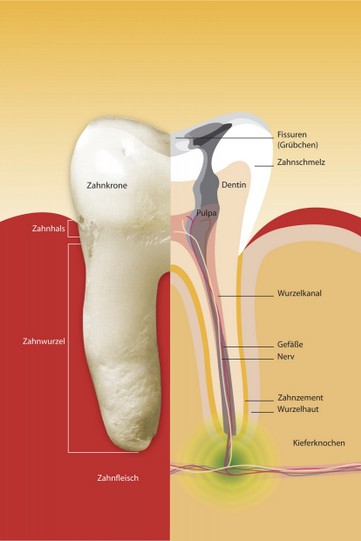 Jeder Zahn besitzt in seinem Inneren eine Struktur, bestehend aus Nervfasern, Blutgefäßen und Gewebe - die sogenannte Pulpa. Weit verbreitet wird (medizinisch nicht